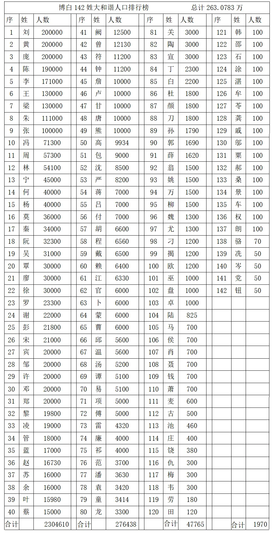 2022年博白和谐促进协会编写的“博白县142个姓氏大和谐“排名榜,大部分数据都是引用博白大观姓氏卷。该表如下: