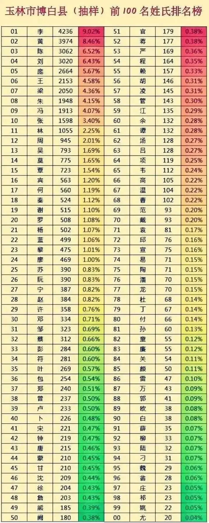 2024年在网上流行这样一份博白县抽样前100名姓氏排行榜,但是这份榜单的来源不清楚,抽样是否对姓氏具有平均性和代表性也就不得而知。据估计可能是来自卫生部门的业务调查数据,经脱去敏感信息后加工整理而成。该排名榜共汇总收集了100个姓氏的46617人进行统计,给出了各姓所点百分比。