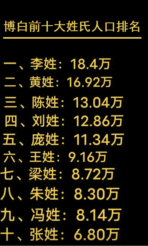 整体来看,李、刘、黄、陈、庞位列前五,王、朱、梁、冯、张排在第六至第十位,这个排序是相对可信、贴合博白实际姓氏分布情况的。