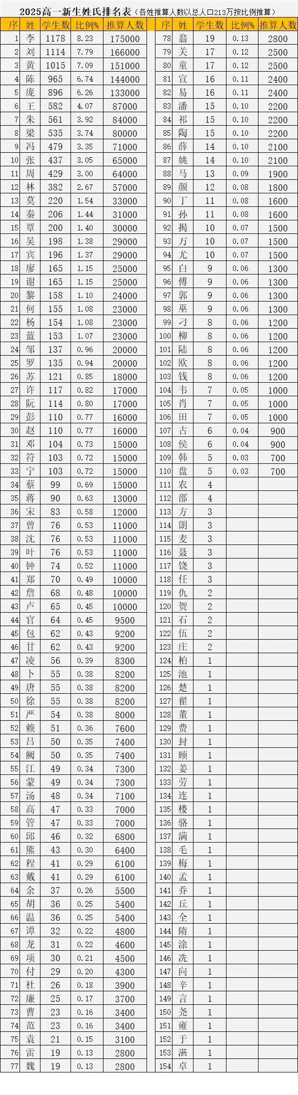 - 在2025高一学生154姓中有20姓是在其他三表中没有的,大部分估计是“学生移民”,这20姓分别是 楚、翟、董、方、费、封、顾、连、楼、满、毛、乔、全、任、隋、向、辛、言、尧、雍