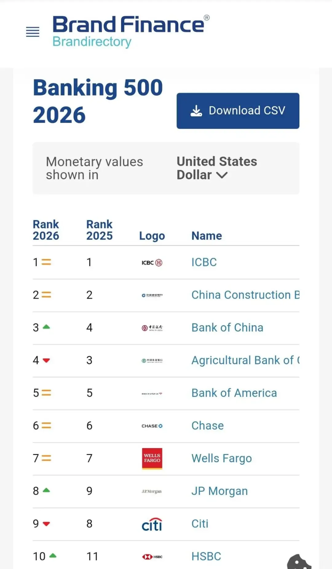 日前,英国品牌估值机构Brand Finance发布了《2026年全球银行品牌价值500强》榜单,中国银行业在全球保持领先地位,榜单前四名被中国四大国有银行包揽,分别是中国工商银行、中国建设银行、中国银行和中国农业银行。