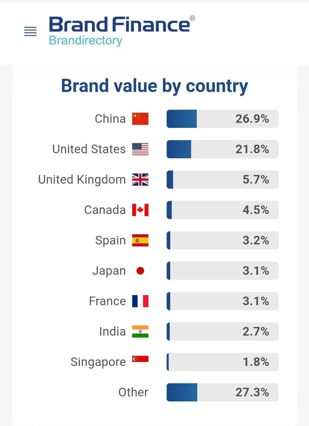 500强榜单中共有70家中资银行机构(含港澳台地区银行及部分具有投行功能的内地证券机构)入选,合计品牌价值达到4824亿美元,占总榜单品牌价值的26.9%,位居全球首位。