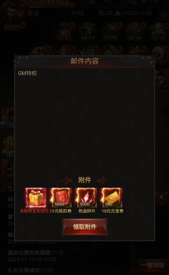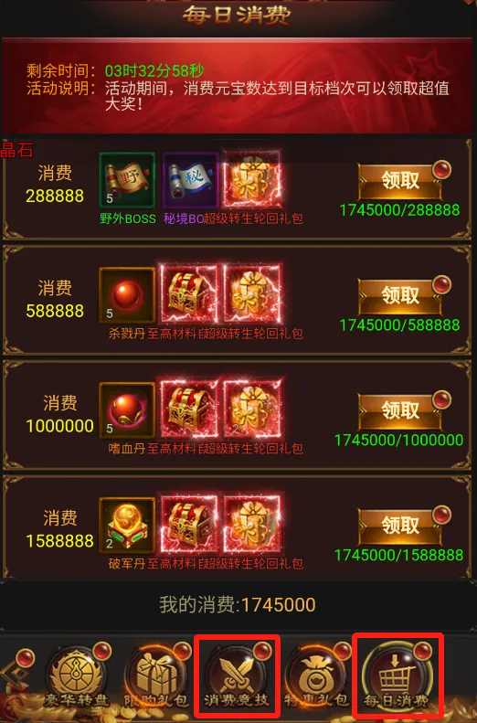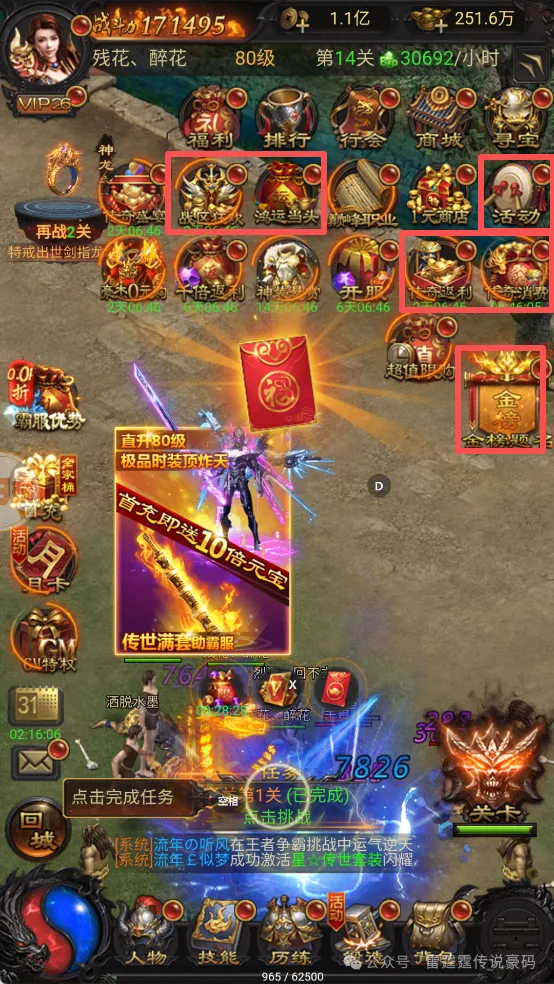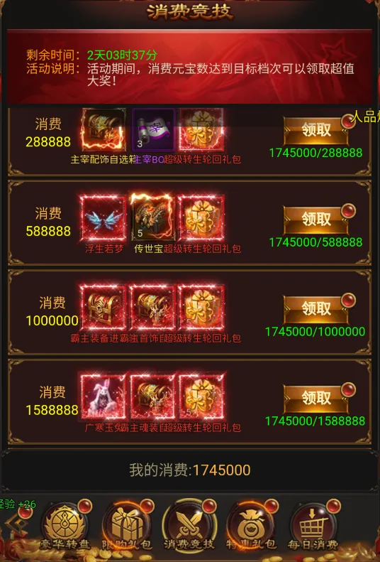 第一步:先找客服·领激活码+超级装备礼包【兑换成功后】第三步:重点活动,全部参与【活动、传奇消费、传奇返利、鸿运当头、战区狂欢、金榜题名】以上这活动,全部参与,并且全部领取~使用完元宝,即可快速领取100个超级无限制转生丹。第四步:直接到背包使用后,去升级转生,即可直升10转。如未达到10转,可重查看这些活动,是否参与完成。【活动、传奇消费、传奇返利、鸿运当头、战区狂欢、金榜题名】