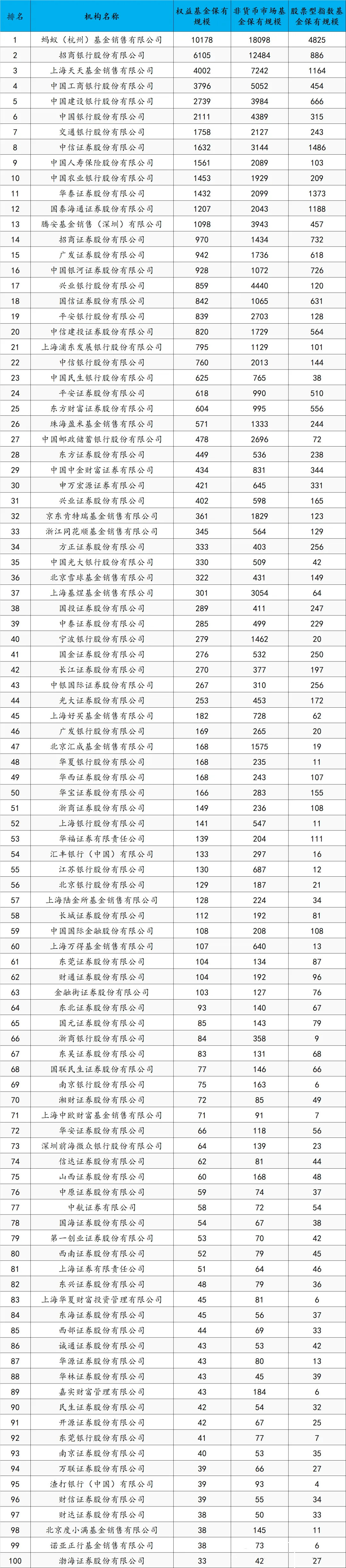 - ①蚂蚁基金:行业首个万亿权益巨头权益基金保有规模10178 亿元(环比 + 23.68%),非货币基金保有规模18098 亿元,股票型指数基金保有规模4825 亿元,三项指标均居榜首,是全市场唯一权益规模破万亿的代销机构,较第二名招商银行高出66.7%,在零售权益市场形成 “断崖式” 领先。
