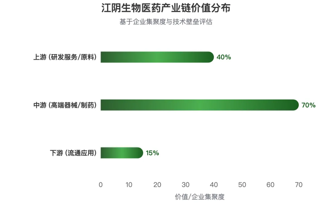 江阴的价值分布呈现 “橄榄形”变体:中游制造(尤其是高端医疗器械)是绝对核心,上游高附加值研发服务正快速崛起,下游相对薄弱。