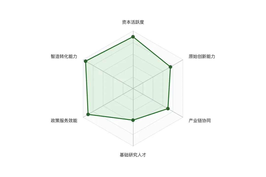 雷达图解读:江阴在 “资本活跃度”、“智造转化能力”和“政策服务效能” 上得分极高,这是其产业发展的核心引擎。但在“基础研究人才”方面存在短板,主要依赖外部引入。