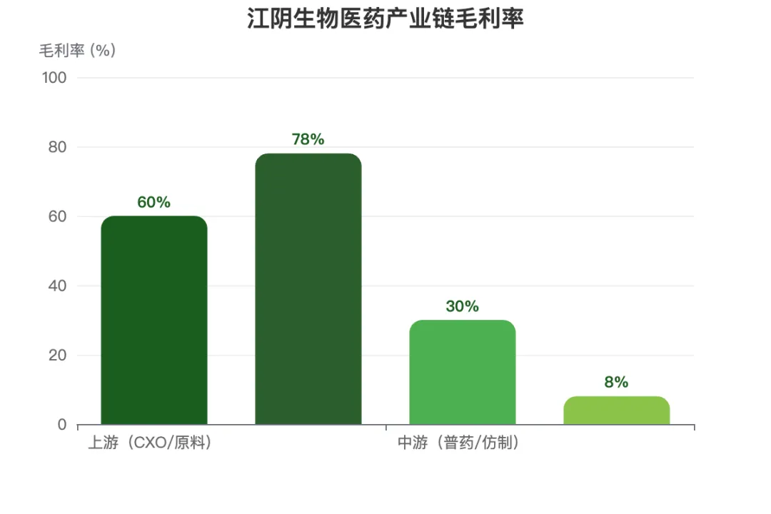 江阴生物医药产业呈现 “中间突破,两端发力” 的哑铃型结构,重点集中在高价值的中游制造和上游研发服务(CXO)的特定领域。