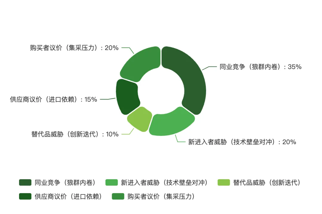 五力图解读:江阴企业当前最大的压力来自 “同业竞争”(狼群之间也有竞争)和 “购买者议价”(集采阴影),而技术壁垒则构成了对抗 “新进入者” 的护城河。