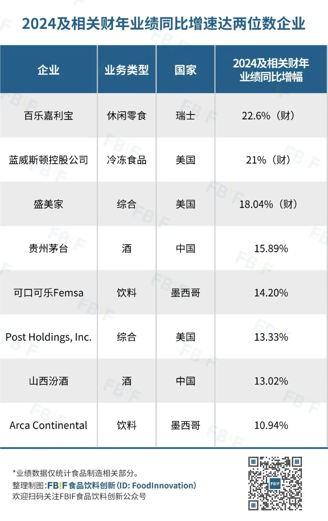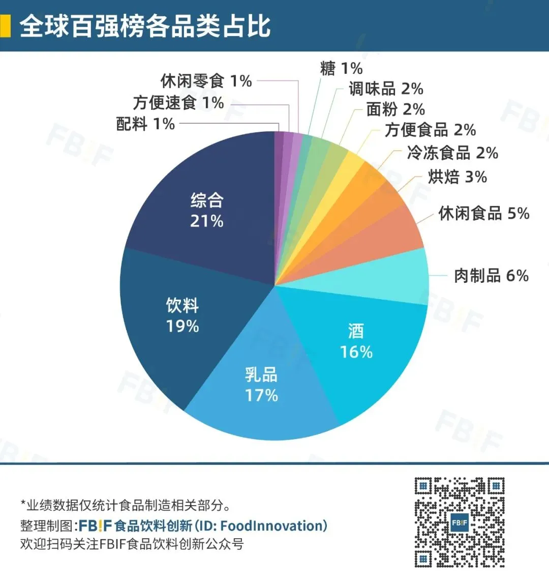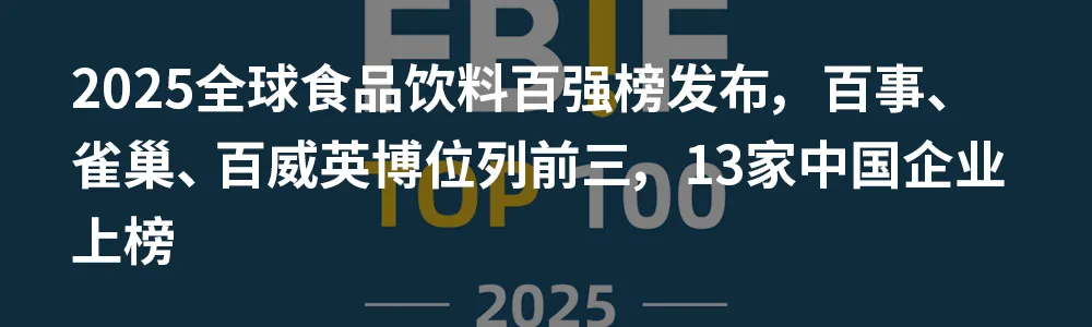 FBIF2026年2月发布的2025全球食品饮料百强榜,反映了当前食品饮料行业多元的格局。一方面,2024及相关财年业绩规模达到2000亿元以上的企业有8家,其业绩之和却占到百强企业业绩之和的37%。另一方面,约三分之一的企业,聚集在300亿元至500亿元这一全球百强榜的“尾部区间”。从不同角度去看百强格局,则可以更清楚地看到,头部食品饮料企业通常呈现出怎样的规模扩张路径。例如,全球百强榜中21%的企业经营综合型业务,表明多品类、多元化的布局,是食品饮料企业实现规模扩张的关键路径。36家上榜企业成立百年,凸显出长期能力积淀与持续深耕,对食品饮料企业实现稳健增长和领跑行业的重要意义。全球百强榜背后,还隐藏着哪些食品饮料企业的成长逻辑?就此,本文将从全球百强榜的整体格局、百强企业的业务类型分布、百强企业的常见成长路径、百强企业的增长情况四个维度,对FBIF全球百强榜进行详细解读。从各业绩区间企业数量的分布来看,FBIF全球百强榜整体呈现出中尾部区间拥挤,头部区间分散的格局。300亿元至500亿元区间,覆盖榜单的第65名至100名,上榜企业数量约占整体三分之一,为全榜集中度最高的营收区间。较高的集中度,使得相邻位次的企业间的营收差距显著缩小,通常被压缩在10亿元内。这一区间内的企业,有两种常见类型。一是聚焦单一品类,二是聚焦于单一市场。比如墨西哥企业Gruma,S.A.B. de C.V.是全球最大的玉米面粉和玉米饼制造商,也是榜单中业绩最高的面粉企业,其榜单排名为67位。排名第74位的综合型企业盛美家(The J.M. Smucker Company),其拥有全美流行的冰冻三明治、果酱等产品,2024财年94%的营收来自美国。盛美家的冷冻三明治产品Smucker's Uncrustables800亿元至900亿元是另一个拥挤的区间。共有15家企业处于这一区间,覆盖榜单的28名至42名。这一区间内的企业,普遍面向更大规模的市场,并在一个天花板较高的赛道中占据头部位置。比如排名第34位的红牛,拥有具有全球影响力的能量饮料品牌Red Bull,排名40位的麦肯食品,是全球最大的冷冻土豆制品制造商。比如排名36位的韩国希杰集团,近些年在海外市场寻找增量。希杰集团财报显示,2024年希杰食品板块海外营收同比增长4.47%,规模达5.82万亿韩元,约占食品板块总营收的40%。[1]过了900亿元的门槛,企业业绩的分布明显更加分散。例如900亿元至2000亿元区间内,企业间最大业绩差值达到941.59亿元,区间内仅有19家企业。进入榜单前十名的门槛为1706.12亿元。榜单的前十名企业间,也呈现出不同的离散程度。整体来看,排名第5至10位的喜力、亿滋国际、兰特黎斯集团、达能、卡夫亨氏和贵州茅台之间的差距相对较小,相邻位次的企业间业绩差值通常在100亿元至200亿元。前四位的百事、雀巢、百威英博和可口可乐,业绩跨度更大,业绩区间覆盖3300亿元至6600亿元。同时,Top4企业的业绩之和,占到前十名企业业绩总和的54.23%。Top10企业的业绩之和,则占百强企业总业绩之和约40%。业务类型:综合类聚集前三分之二,饮料类增长路径多元全球百强榜中共有21家综合型企业,是榜单中占比最高的业务类型。此外,上榜数量超过10家的类型还有饮料、乳品和酒,这三个类型的上榜企业数量分别为19家、17家和16家。上述四类企业在全球百强榜中合计占据74 席,且每一类的企业数量均显著领先于其他品类。紧随其后的是肉制品、休闲食品、烘焙等品类。具体来看,各类型企业在榜单中的分布规律,以及企业规模扩张的核心驱动力各不相同。综合型企业在榜单中的排名较靠前,共有17家排名榜单的前三分之二(67名之前)。同时,年营收超1000亿元的综合型企业达7家,各类型中最多。综合型企业通常覆盖多种高频消费的品类,这既为其拓宽了收入来源,也使其拥有更强的抗风险能力。以雀巢为例。2024年财报显示,雀巢共有7大业务板块,其中,粉状及液体饮料、乳制品及冰淇淋、营养与健康科学、预制菜肴及烹饪辅料、宠物护理(宠物食品不计入榜单业绩)5个板块的营收都超过100亿瑞士法郎。此外,部分企业即便将核心资源聚焦单一市场,仍可凭借在当地多品类的市场影响力,跻身全球百强。这类企业包括印尼的Indofood(2024年业绩达到524.51亿元)、菲律宾的San Miguel Food and Beverage(2024年业绩达到506.3亿元)等。相比于集中在头部和中段的综合型企业,乳品、饮料、酒类企业在榜单中的名次分布更分散。不过,尽管三类企业在排位分布上具有共性,但各自的主导业务模式却有显著差异。据统计,入榜的17家乳品企业中,有16家同时经营至少3种乳品品类,其中主要包括奶酪、黄油、牛奶、酸奶、冰淇淋等。唯一一家聚焦单品类的是总部位于英国的Froneri,该企业聚焦冰淇淋品类,2016年由雀巢与私募股权基金PAI Partners合资组建。从细分品类的分布来看,16家上榜酒企中共有6家啤酒企业、4家白酒企业和3家主营烈酒的企业。头部啤酒企业倾向于通过全球化的渠道网络和庞大的品牌矩阵,来尽可能覆盖更多消费群体。以百威英博为例,2024年财报显示,百威英博旗下共有超500个啤酒品牌,其中包括全球品牌、多国品牌以及区域品牌等。烈酒和白酒品类下的入榜企业,则全部通过定位高端化,从而获得高溢价。不过,国际烈酒巨头的高溢价模式,也面临一定挑战。帝亚吉欧、保乐力加、酩悦·轩尼诗-路易·威登集团旗下的酒类业务板块,都在2024年及相关财年