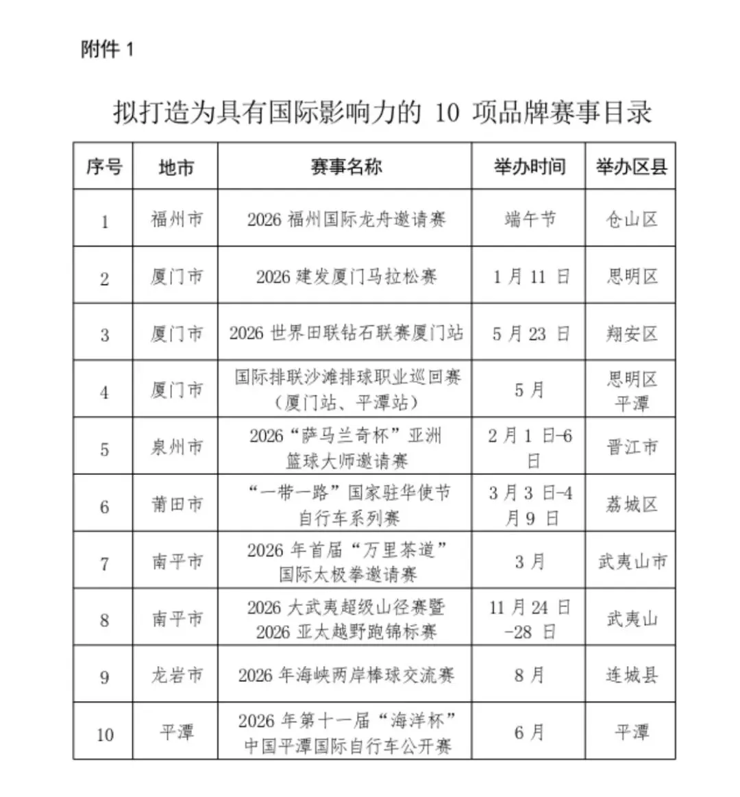 福建将以“十、百、千” 为核心目标,构建分层递进、特色鲜明的赛事品牌矩阵:打造10项国际影响力赛事,对标国际一流、融入绿色办赛理念,打造城市国际化名片;培育100项全国影响力赛事,深化文旅商体融合,彰显福建山海人文特色;举办1000项大众品牌赛事,贴近群众需求、繁荣基层体育消费。全省体育部门将履行统筹协调与品牌培育职责,建立省市县三级联动机制,强化赛事全流程管理,推动市场化运营,严守赛事安全底线。
