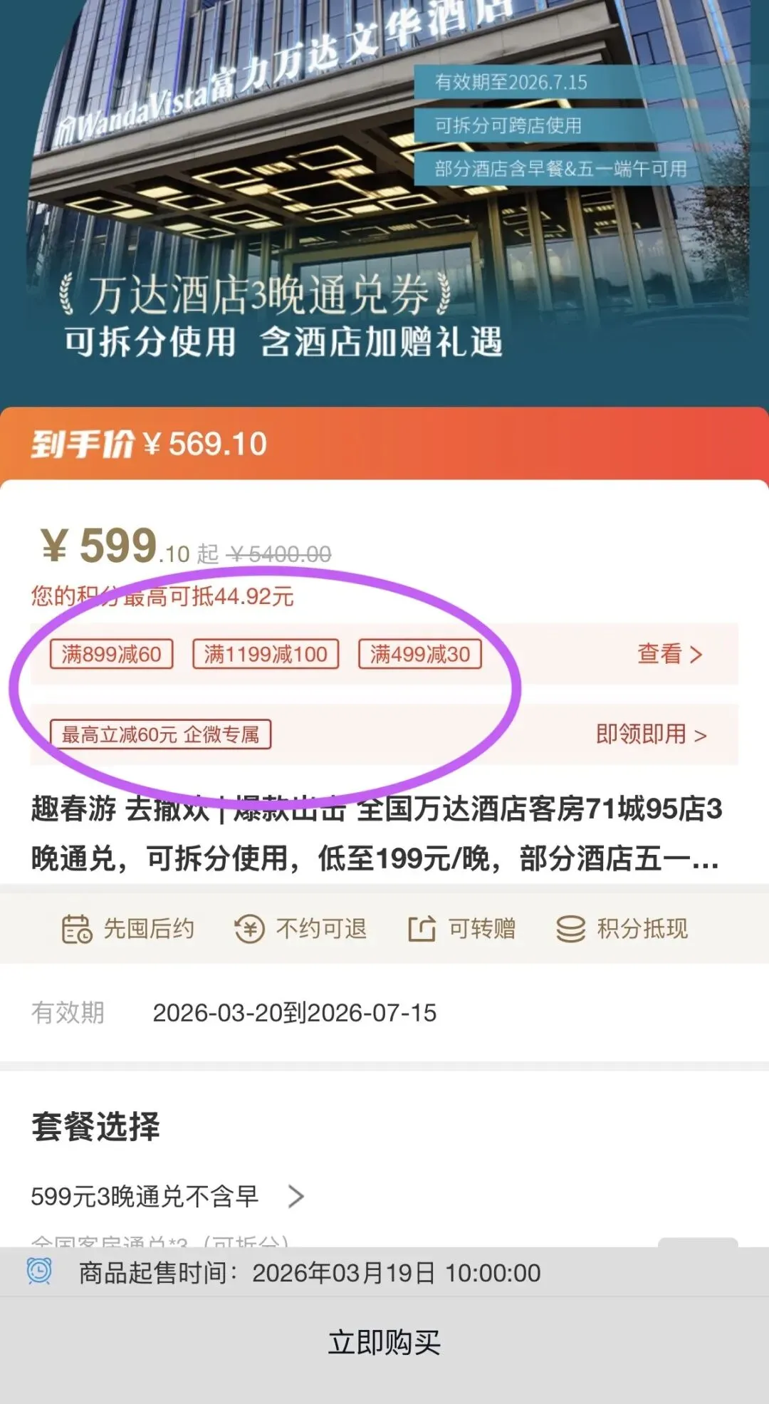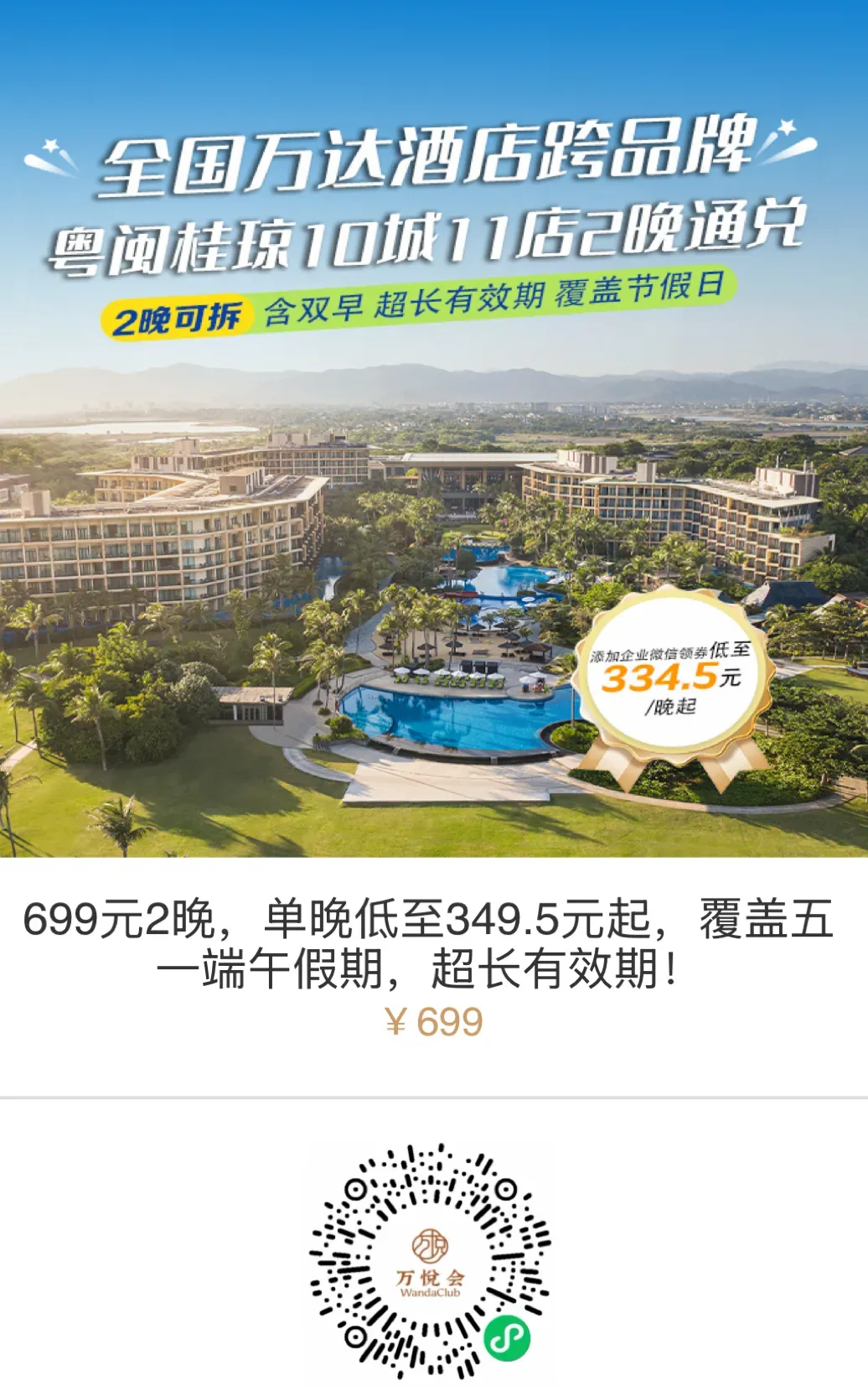 【万达粤闽桂琼10城11店通兑】699元起/2晚,可拆分。单件券后669,平均334.5元起一晚!