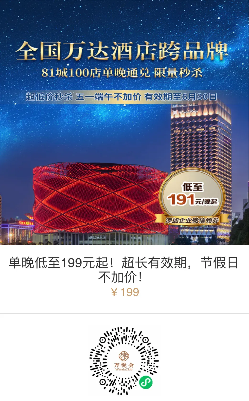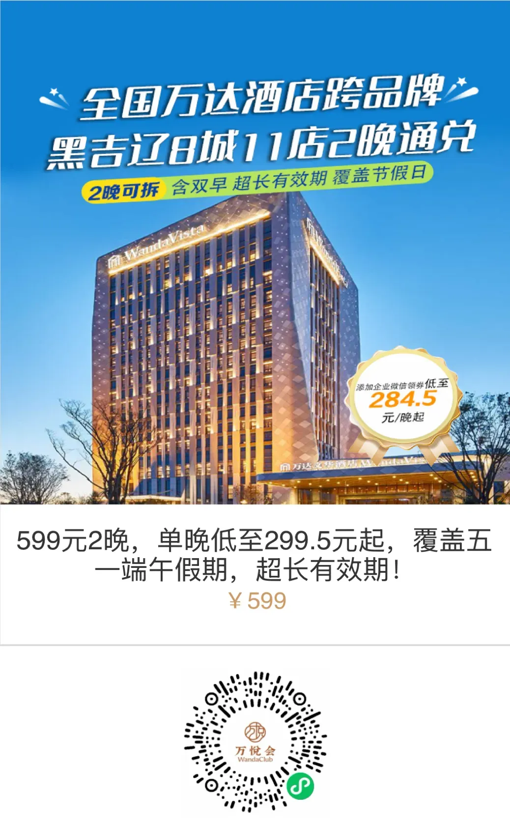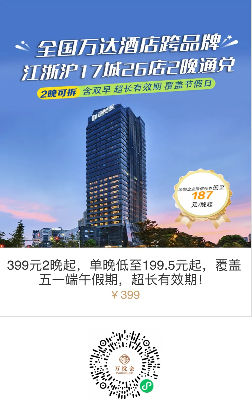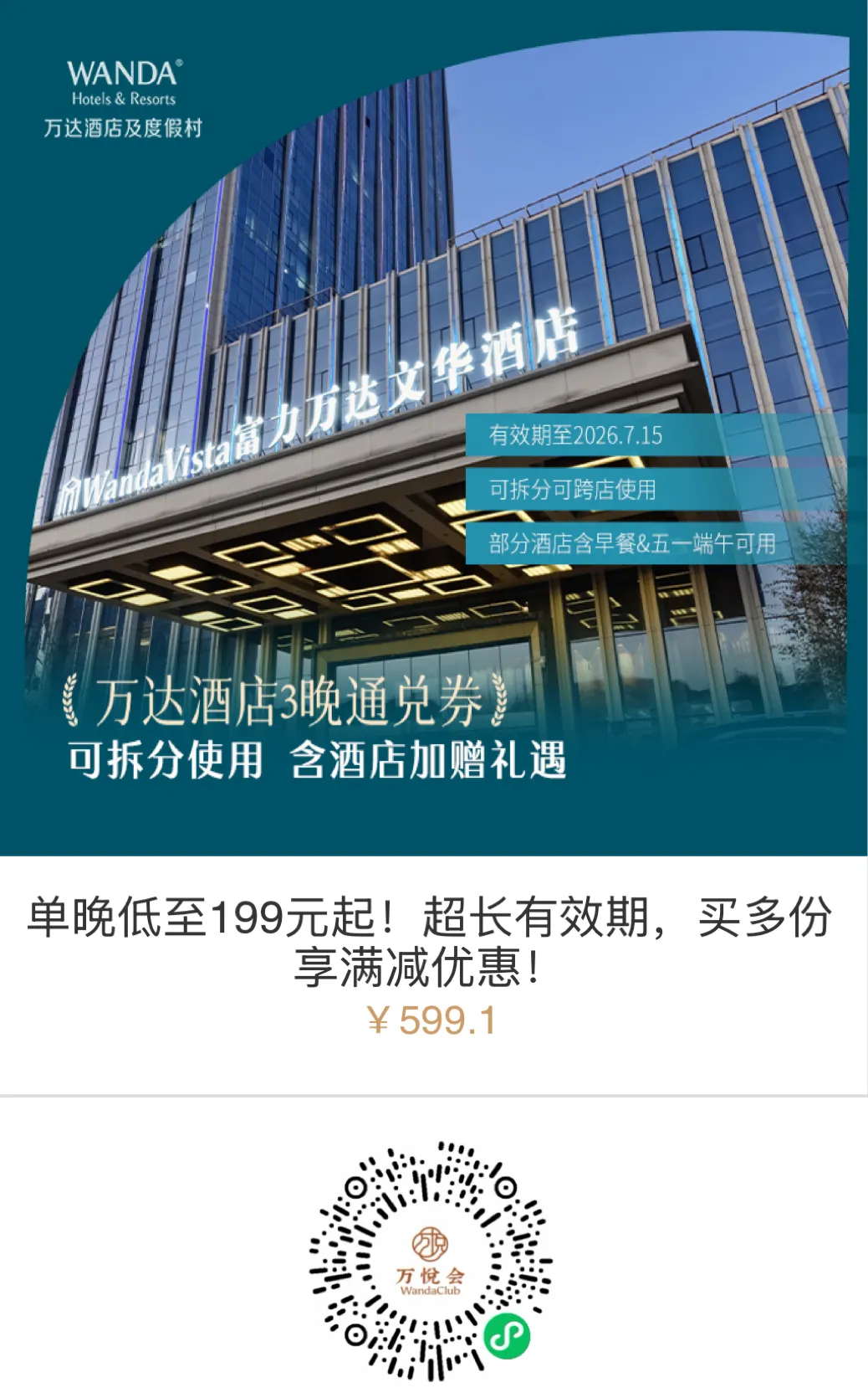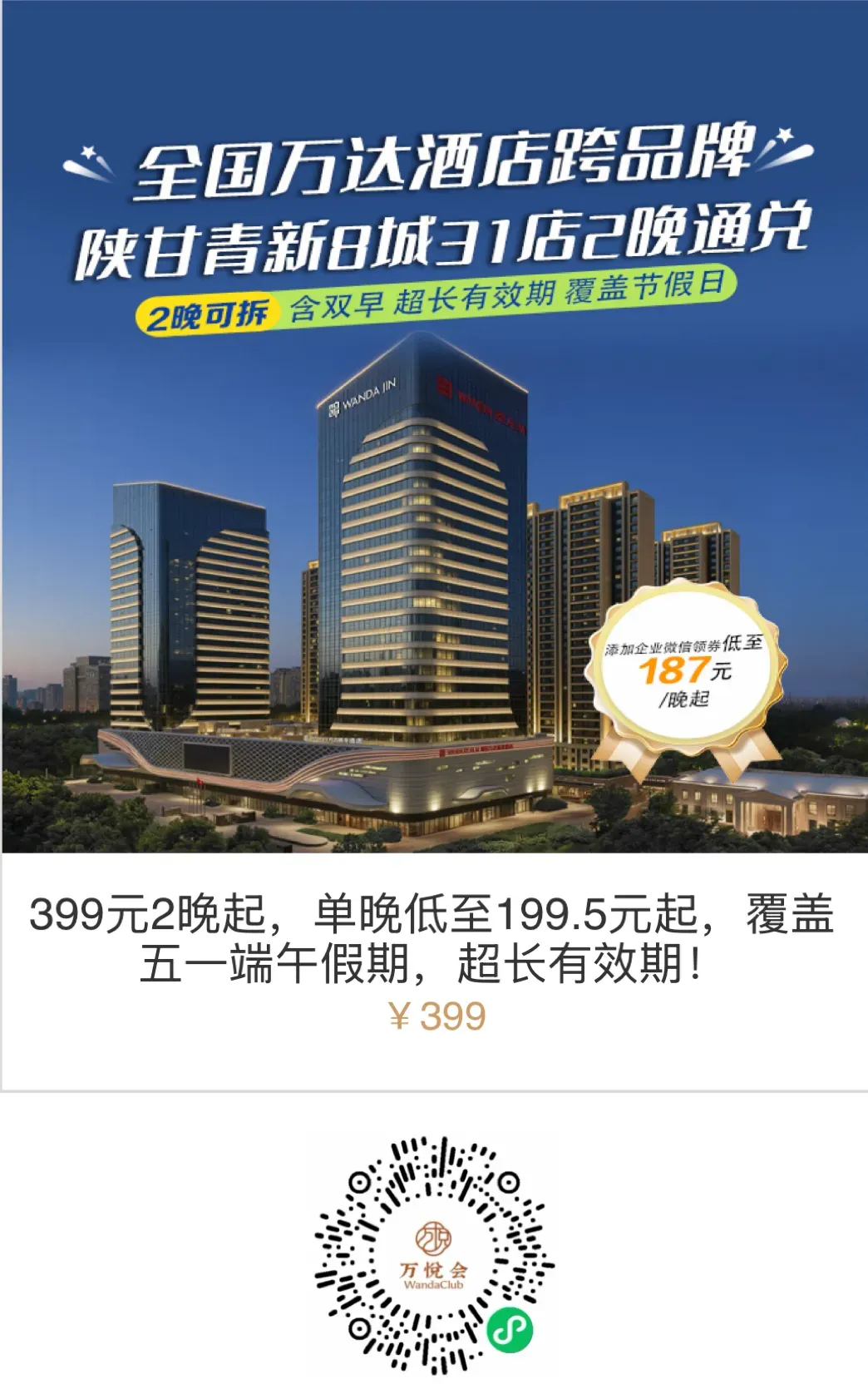 【万达陕甘青新8城31店通兑】399元起/2晚,可拆分。单件券后374,平均187元起一晚!