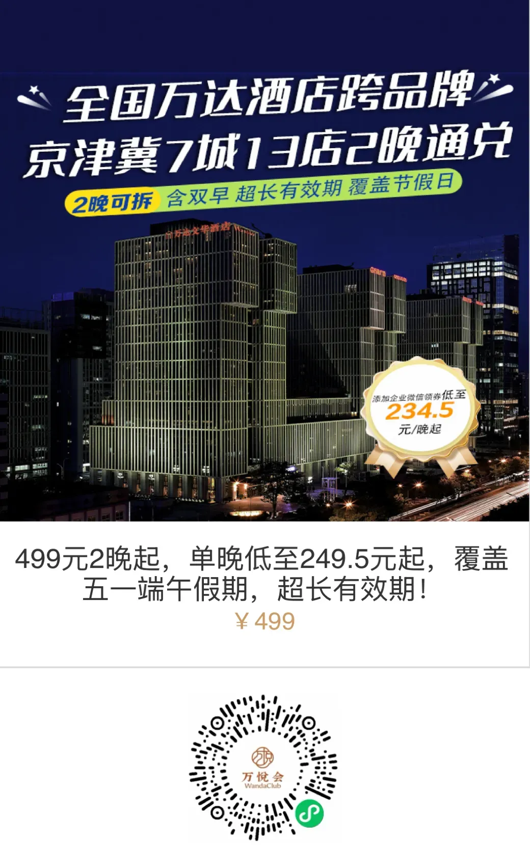 【万达京津冀7城13店通兑】499元起/2晚,可拆分。单件券后469,平均234.5元起一晚!
