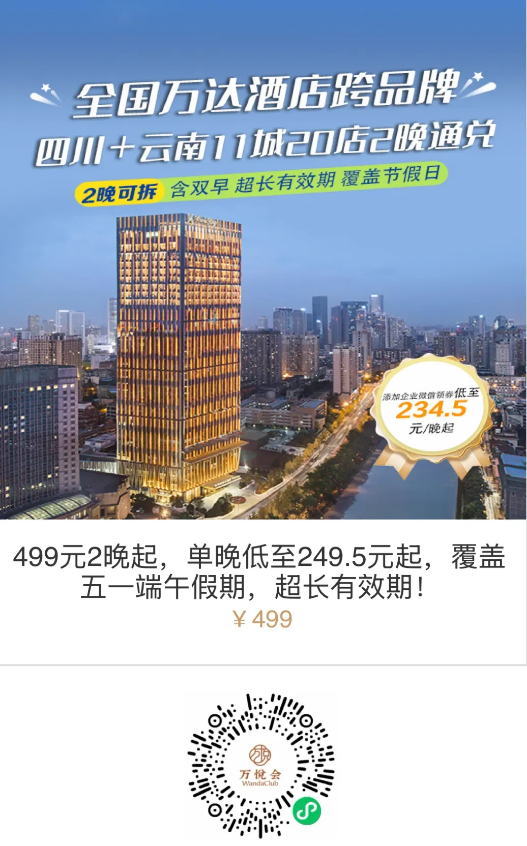 【万达四川/云南11城20店通兑】499元起/2晚,可拆分。单件券后469,平均234.5元起一晚!