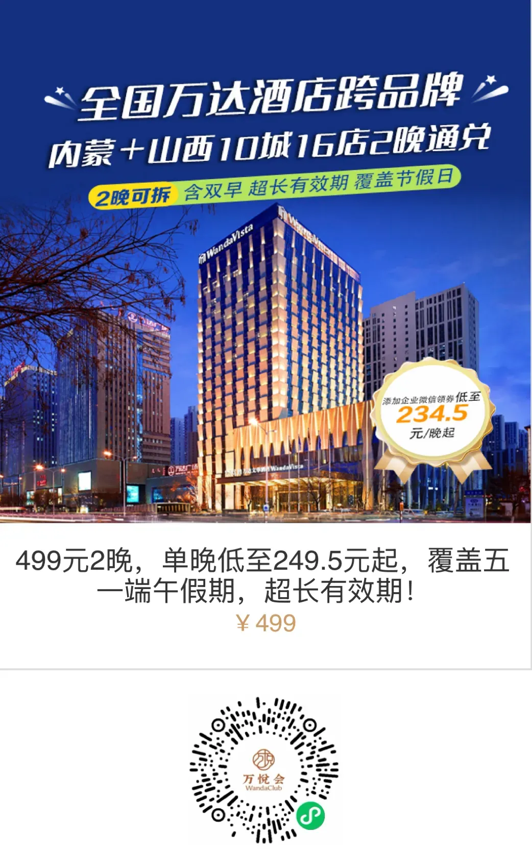 【万达内蒙/山西10城16店通兑】499元起/2晚,可拆分。单件券后469,平均234.5元起一晚!