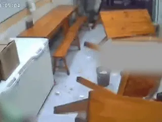 桌椅板凳被撞得东倒西歪,餐具的碎声、桌椅的碰撞声,混在一起,刺耳又揪心。