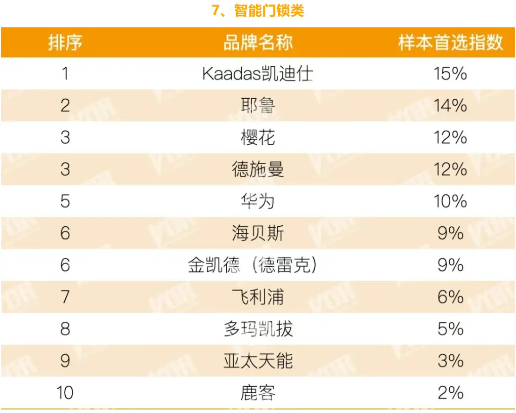 在锁具板块,凯迪仕、德施曼、耶鲁、华为、海贝斯、松下、雅洁、樱花等品牌入榜。