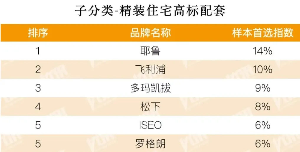 接下来,我们再来看看锁具的子分类——精装住宅高标配图智能门锁。耶鲁以14%的样本首选指数为了第一,飞利浦以10%的样本首选指数位列第二,多玛凯拔以9%的样本首选指数位列第三,松下以8%的样本首选指数位列第四,ISEO及罗格朗以6%的样本首选指数并列第五。
