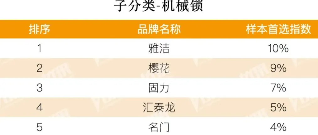 最后,我们再来看看锁具板块的子分类——机械锁。雅洁以10%的样本首选指数位列第一,樱花以9%的样本首选指数位列第二,固力以7%的样本首选指数位列第三,汇泰龙以 5%的样本首选指数位列第四,名门以4%的样本首选指数位列第五。