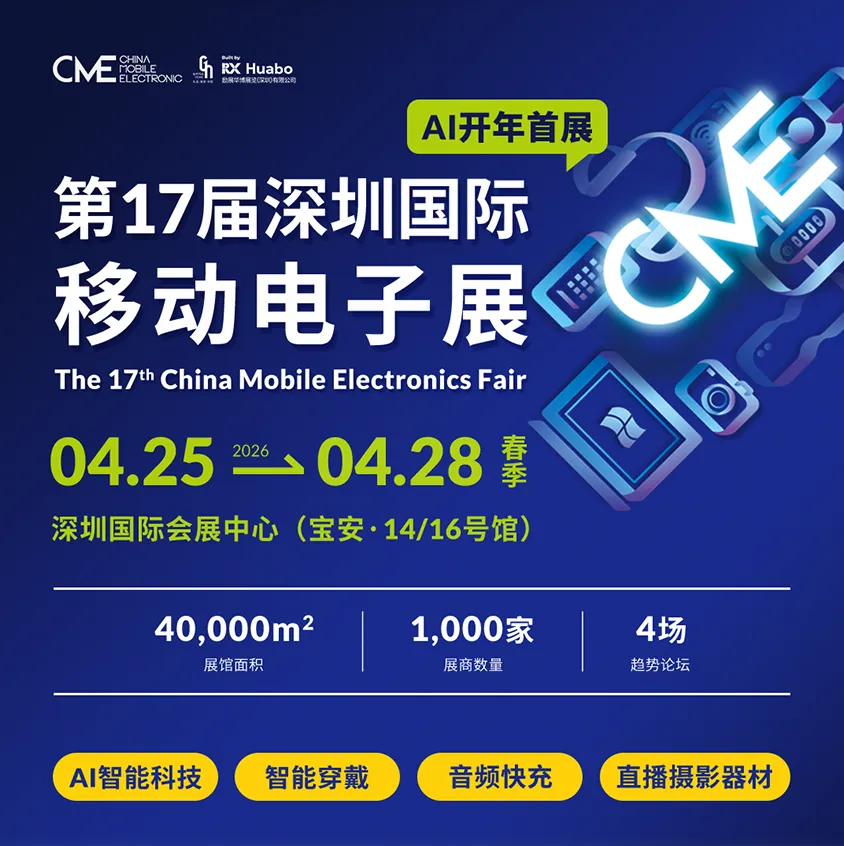 2026深圳国际移动电子展4月25-28日在深圳国际会展中心(宝安)举办!春季展将展出4万㎡展览规模,2大移动电子主题馆,汇聚1000家优质品牌展商,4场同期趋势论坛,打造一场“资源领航+趋势掌舵+增长续航”的消费电子盛宴!