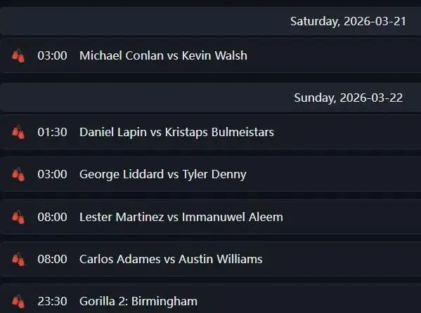 周末迈克.康兰在英国的比赛没什么哪场值得推荐。两次击倒博哈丘克的布兰登.亚当斯周日和英国不败拳手比赛,争夺中量级腰带挑战权,是一场好比赛,但是没有直播源。