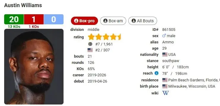 一、卡洛斯.亚当斯VS 奥斯丁.威廉姆斯 中量级拳王卫冕。周日上午主赛。