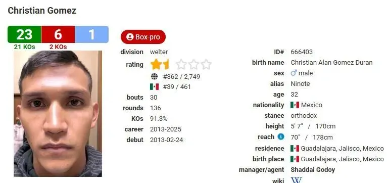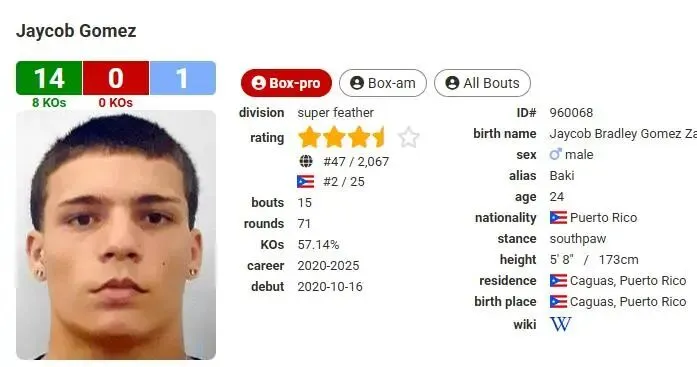 四、又一个戈麦兹(14胜8KO)VS马克斯曼(12胜9KO),俩人击倒率都可以,可惜是轻量级,级别小了点可能不太震撼。