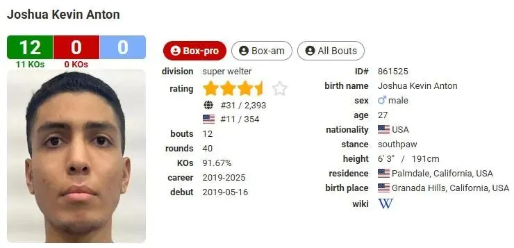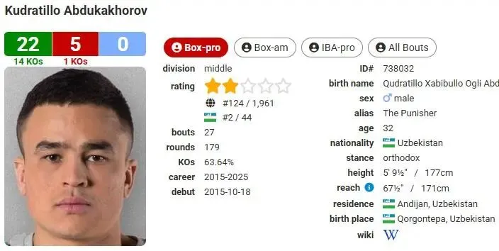 六、安东(12胜11KO)VS 乌兹别克拳手(22胜14KO5负)。这个乌兹别克拳手曾经很牛,但真实水平有点水,黑过老将路易斯.克拉佐。最近5场输了3场。