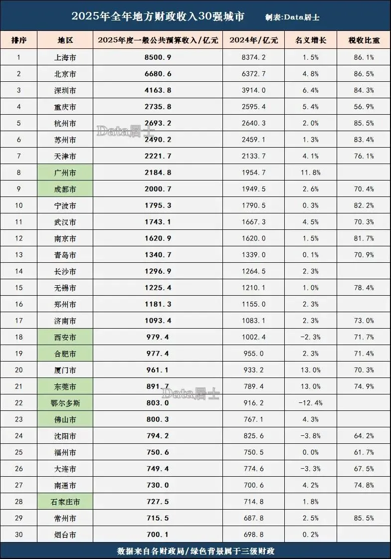 那么在刚过去的2025年各地财政走向是否能摆脱连续几年的较低迷态势而更稳健些吗?相较上一年确实是有些企稳趋势的但总体来说仍有上行压力存在,这点从经济实力强劲的30强城市的整体走向上就能集中反映出来的。