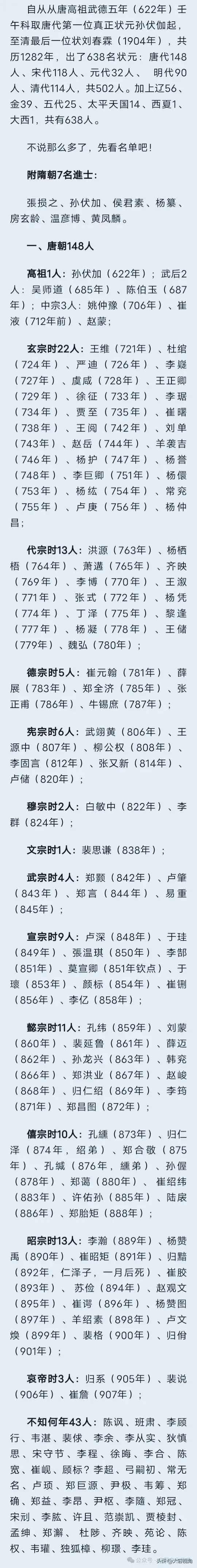 这份长达638人的金榜题名册,不仅完整收录了自唐高祖武德五年(622年)至清光绪三十年(1904年)的所有状元,更揭秘了诸多鲜为人知的科举秘辛。