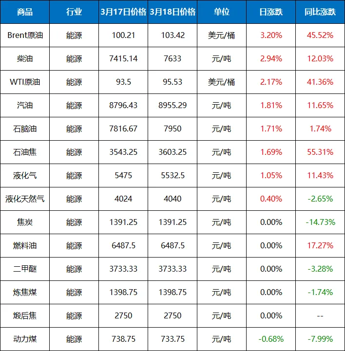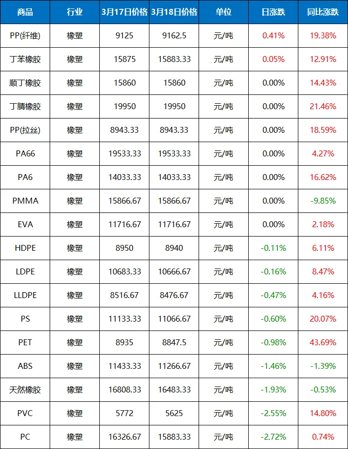 2026年(3.18)橡塑大宗商品价格涨跌榜