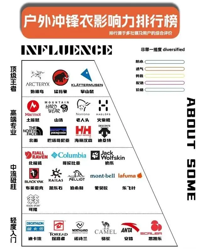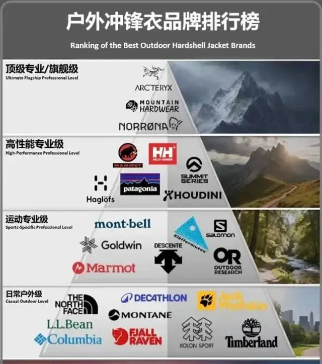 户外品牌不是越贵越好,得看定位。圈内公认大致分5档(结合8264、知乎、小红书等多方共识):
