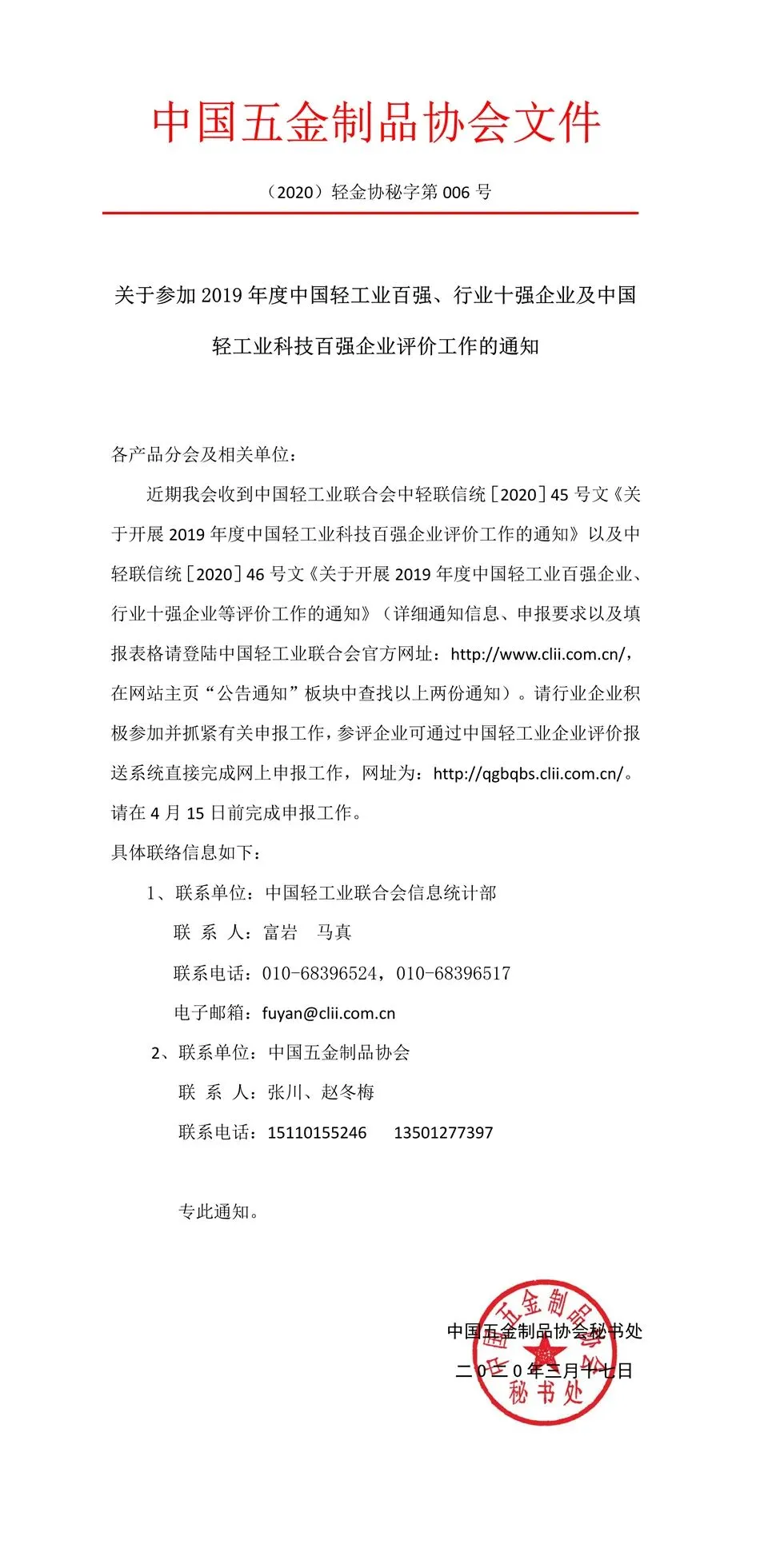 >关于参加2019年度中国轻工业百强企业及中国轻工业科技百强企业评价工作的通知