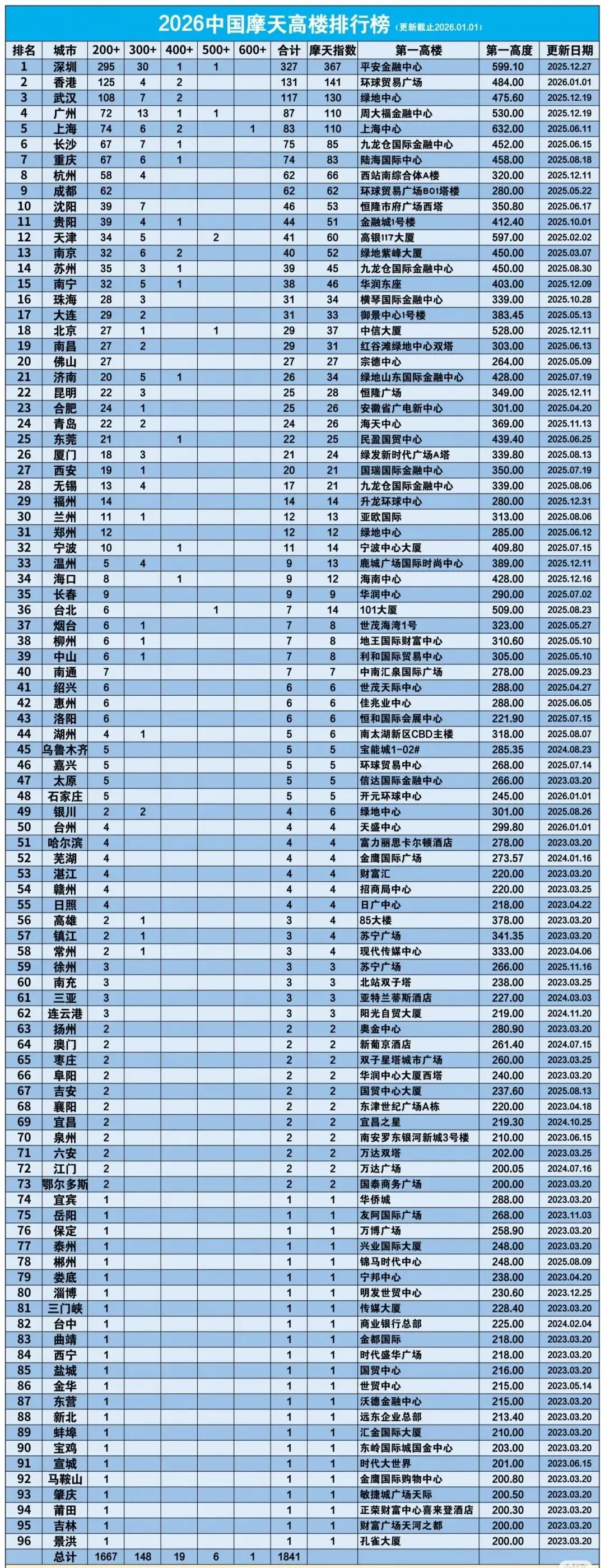 中国摩天大楼数量城市排行榜(数据截止到2026年1月1日)