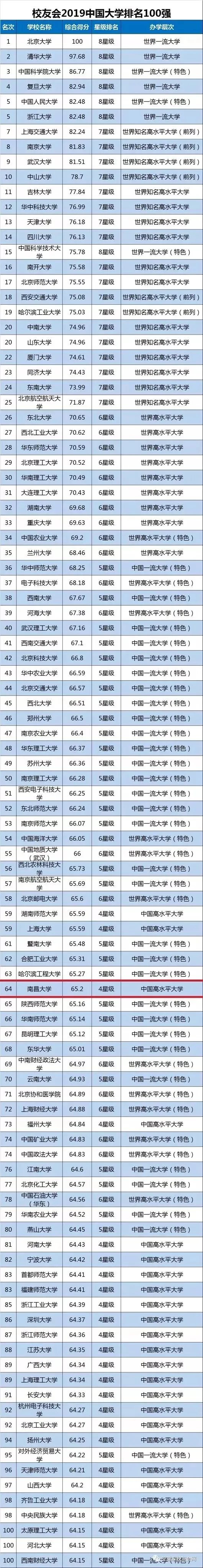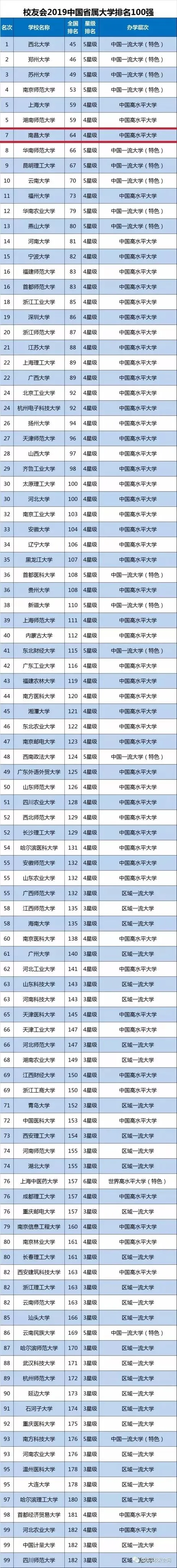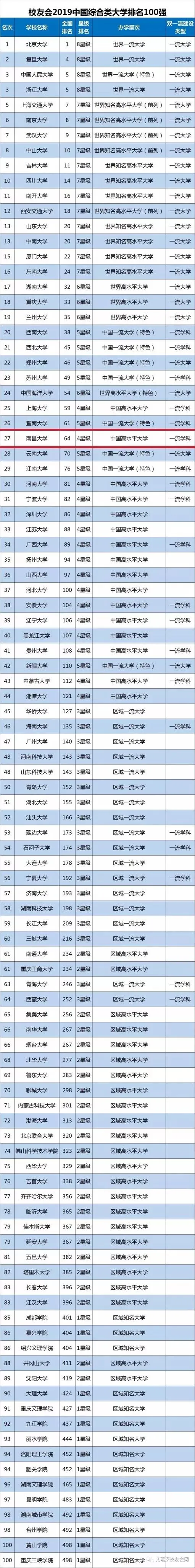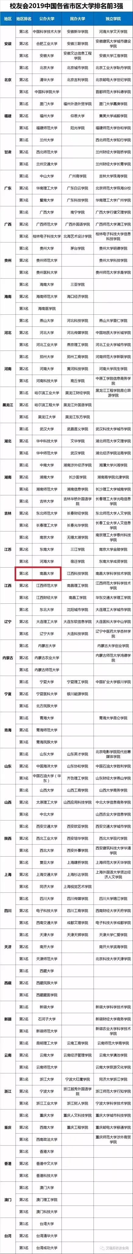 近日,由艾瑞深中国校友会网(Cuaa.Net)编制完成、科学出版社即将出版发行的《2019中国大学评价研究报告—高考志愿填报指南(校友会版)》最新公布校友会2019中国海峡两岸暨港澳大学排名500强、2019中国大学分档次排名、2019中国各省市区大学排名、2019中国重点大学排名150强、2019中国双一流大学排名、2019全国重点高校排名等榜单。报告显示,南昌大学在多个榜单中排名位居第64,在综合类大学排名中位居第27,在全国省属高校排名中位居第7。