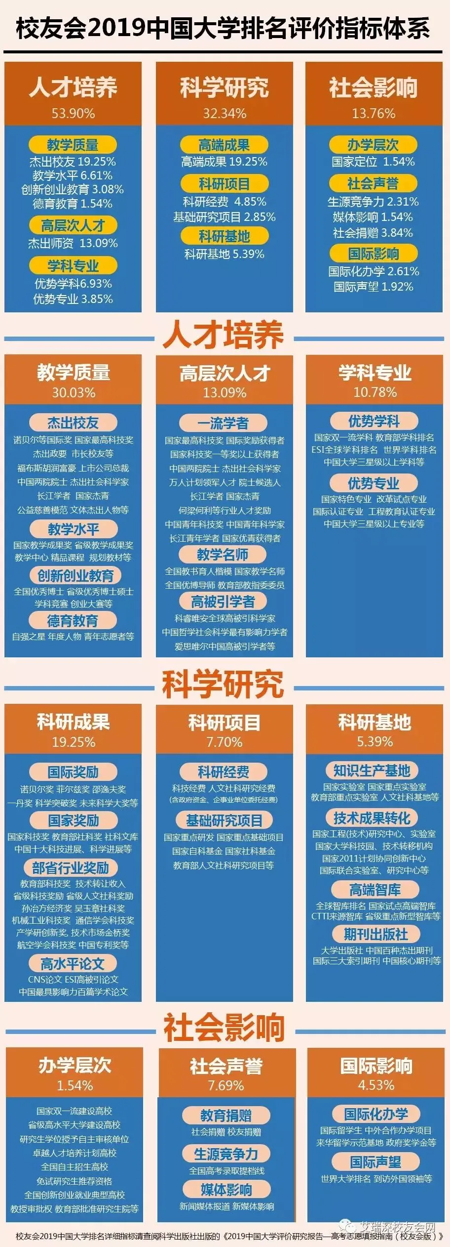 校友会2019中国大学排名共采用了教育教学质量、高层次人才、学科专业、高端科研成果、科研项目、科研基地、办学层次、社会声誉和国际影响等9大核心评价指标,涵盖300多项四级评价指标,基本覆盖国内外其他中国大学排名的高端质量指标。