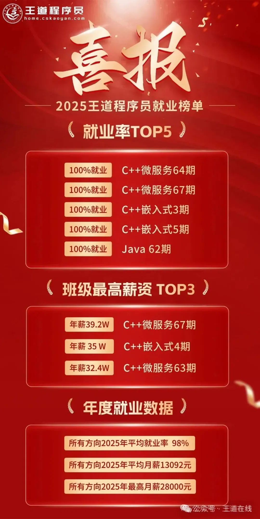 2025年王道训练营的就业数据也很亮眼,多个班级达到100%就业,最高薪资直冲40W!