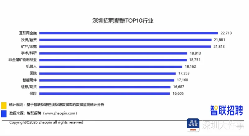 节后招聘薪酬TOP10行业中,深圳排名前五的分别是:互联网金融、投资/融资、 矿产/采掘、 学术 / 科研、非金属矿物制品业。