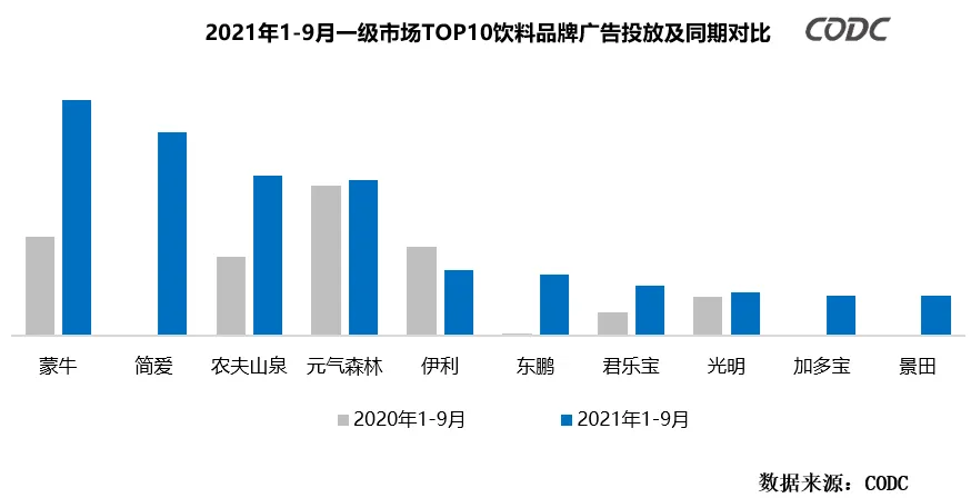 从TOP10品牌投放看,今年前三季度蒙牛、农夫山泉、东鹏、君乐宝、加多宝、景田等品牌广告同比呈现了突飞猛进的增长,新锐品牌简爱首次大规模投放户外广告,表现突出,位列前十榜第二名。前十品牌为饮料行业的广告增长贡献了主要力量。