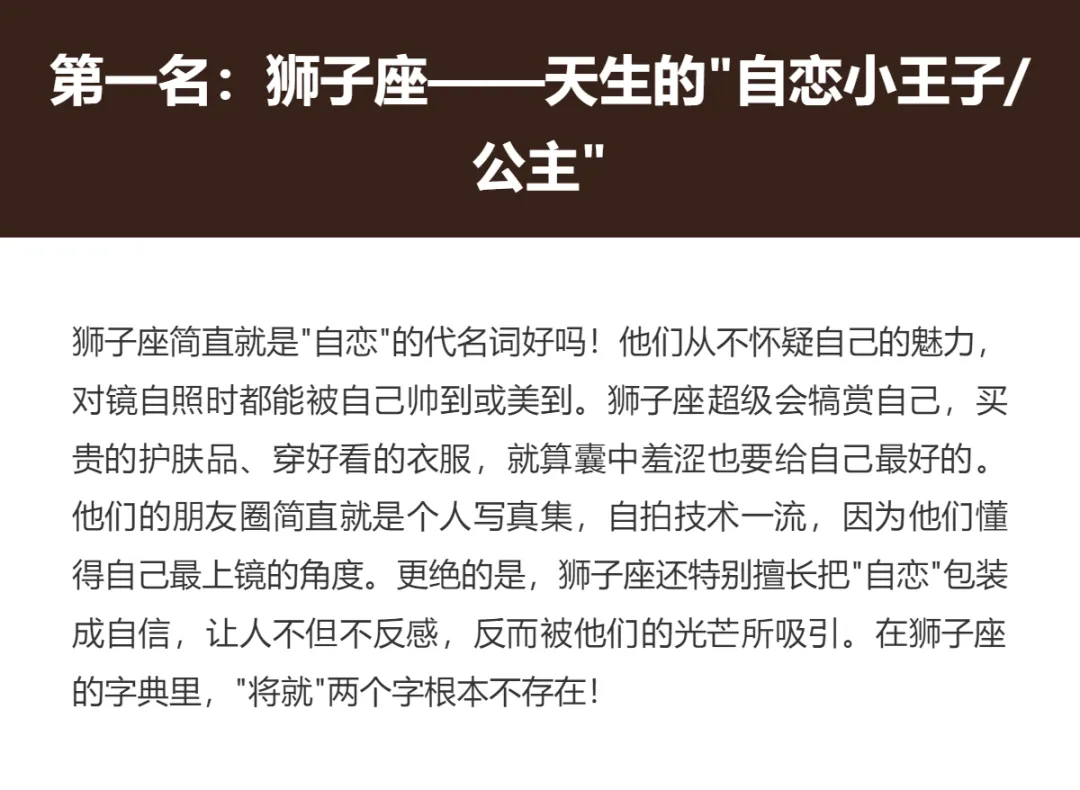 在星座的世界里,有些人就是特别会"爱自己",他们把自我照顾和自我欣赏发挥到了极致。这种"爱自己"并非自私自利,而是一种健康的自我关爱态度。他们懂得保养自己、善待自己,甚至有点"自恋",但这种特质让他们活得特别精彩,也特别有魅力。今天我们就来聊聊十二星座中,哪三个星座最会"爱自己",他们究竟是如何把"自爱"这门艺术发挥得淋漓尽致的呢?