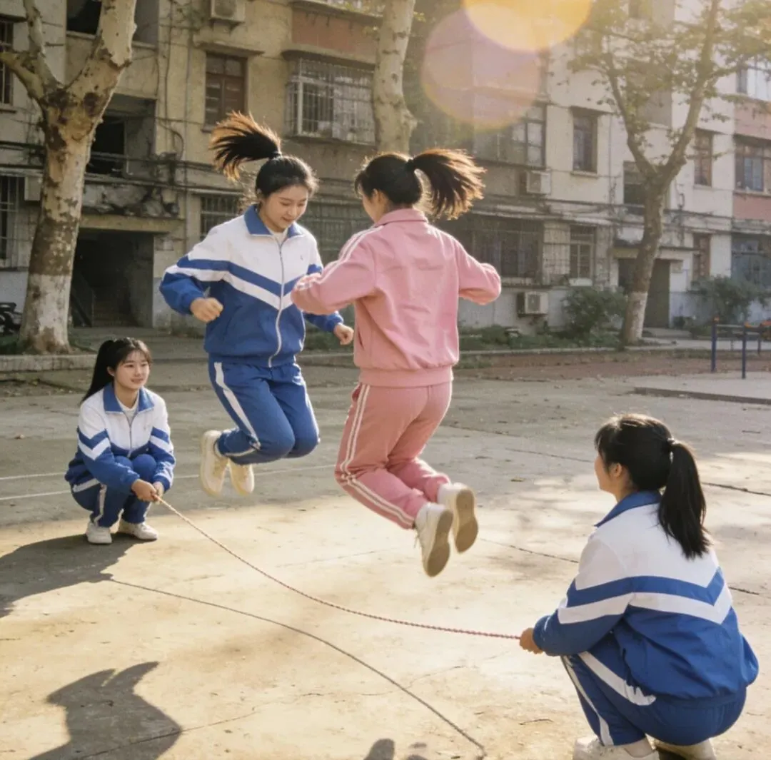 户外游戏更是热闹:跳皮筋、丢沙包、打弹珠、跳房子、滚铁环。