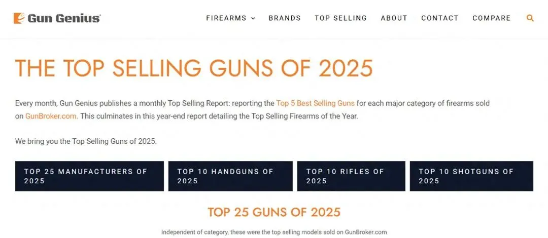 全美最大的枪支交易平台GunBroker每月都会发布畅销报告,按细分类别和销量对畅销枪支进行排名。将这些月数据积累起来,就有了这份2025年畅销枪支综合排行榜,以下是具体的枪支品牌和型号。