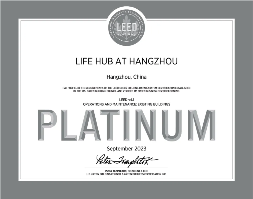 LEED V4.1铂金级认证获奖证书