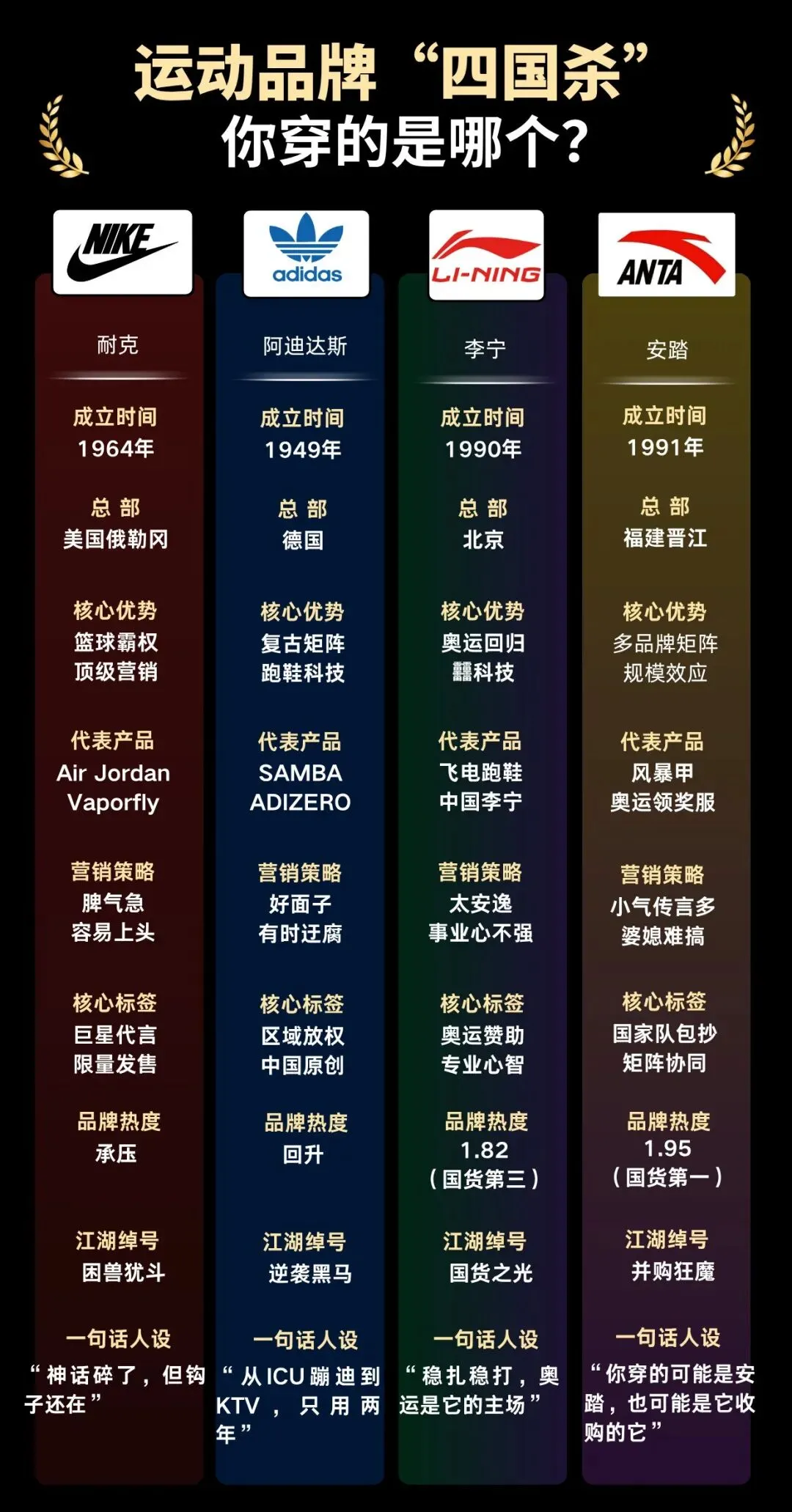 穿耐克的说自己“懂球”,穿阿迪的说自己“潮”,穿李宁的说自己“支持国货”,穿安踏的说自己“实在”。