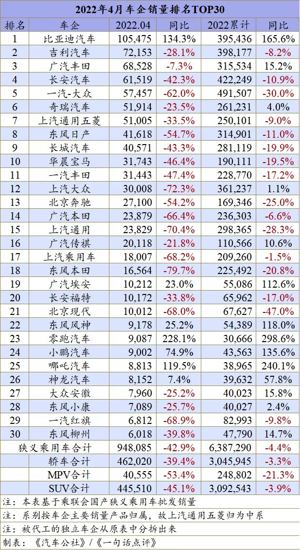 4月车市骤跌43% 比亚迪首次成为“双冠王”