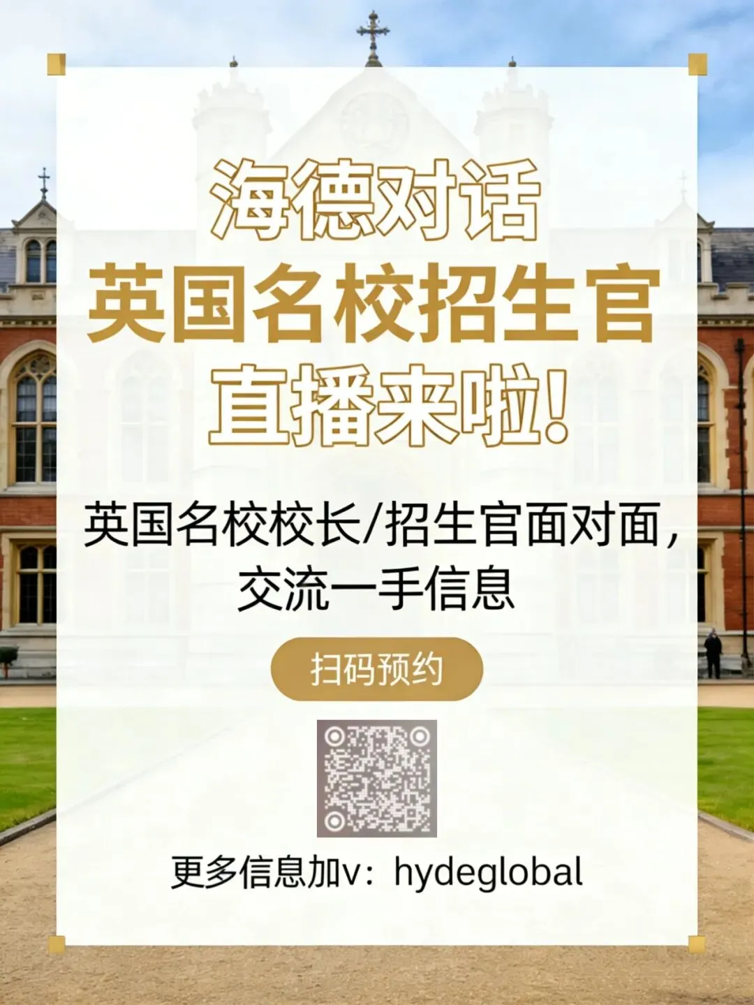 3月24日下周二,海德邀请到英国多年ALevel蝉联全英第一的卡迪夫高中的校长做客直播间,超多干货,扫码预约不错过~