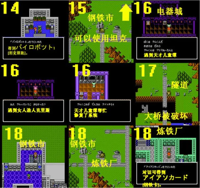 21.去钢铁市右2的机器人工厂,里面有个机器人チツワ (基尔)同伴,现阶段它无攻击能力,有4个队员前建议不要加入。 机器人工厂里可找到: カロリー500[HP回复500],ステロイド[类固醇], HPキツト2[HP中回复魔法],ロボバーツ[机器零件]。