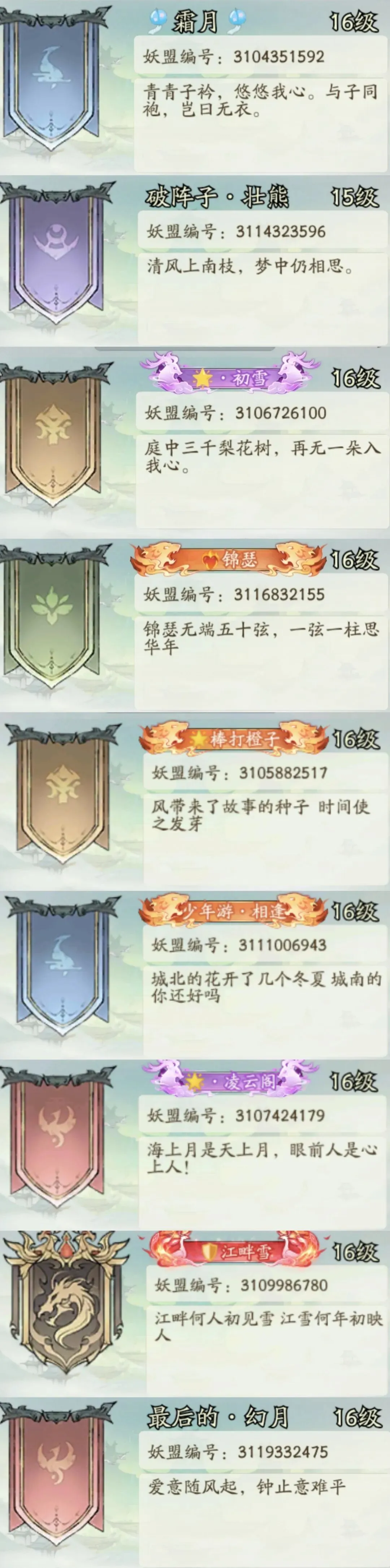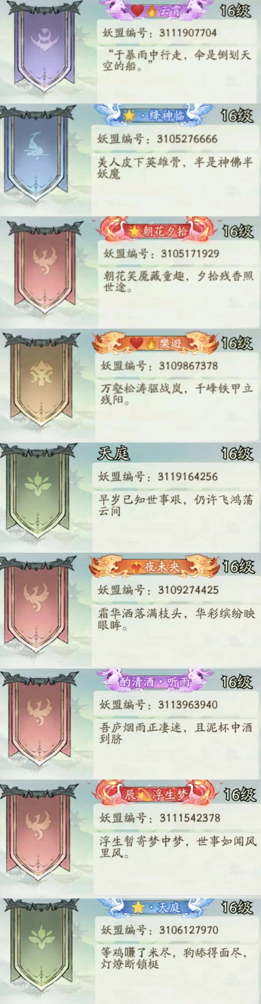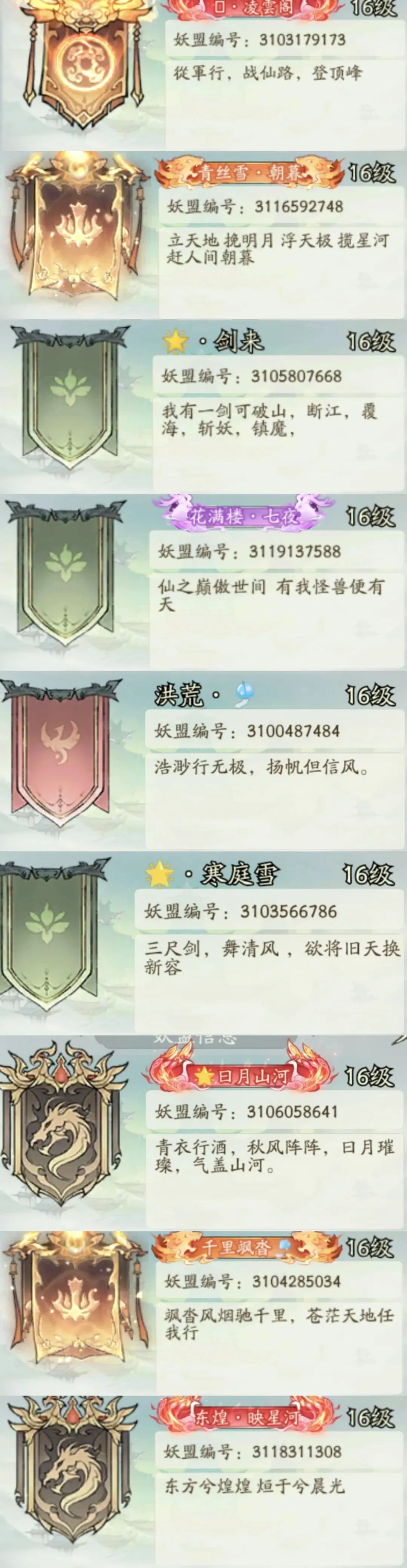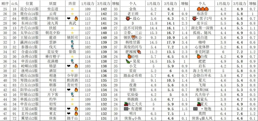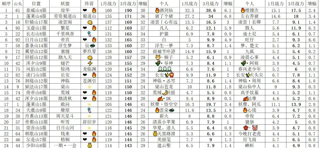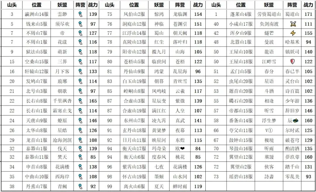 琼华凭借寻道最强的双车头酒剑仙和檀健次妖盟战力到达了190万亿,不仅领跑1-99山头,也领跑整个寻道的山头。这个位面第一梯队的妖盟❤️🔥联盟占了八个,约三分之一,其次是🌟联盟和“词赋”联盟(由于这个联盟名字引用诗词歌赋里面不同的意象)各占四个,剩下三分之一则是👊🏻/🎐/💫/💰/⚡等联盟。