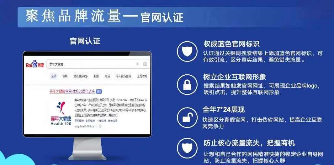 官网认证是百度通过对网站经营主体资质、网站安全性、网站权威性等进行核查后,在搜索结果中的商家官方网站标题右侧展现蓝色官网标识,以帮助网民快速识别权威优质网站,防止山寨网站、钓鱼虚假网站对网民的侵害。