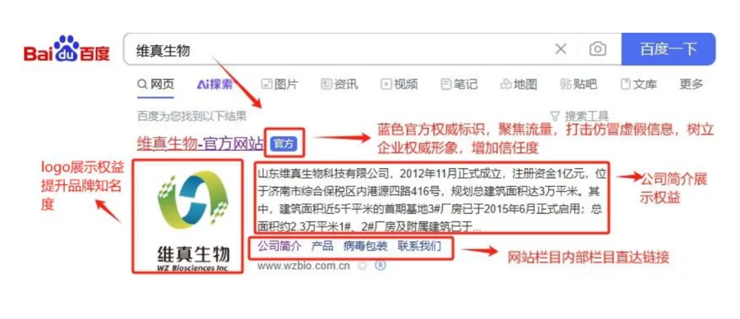 搜索官网认证词时,网站标题后方有蓝色权威官方标识、可以始终让网站保持在首页自然位置前三,还可以把公司的logo、公司简介以及网站栏目展示的权益,提升公司的品牌形象,防止山寨、钓鱼虚假信息对网民和网站主体造成侵害。